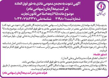 مطالعه بیشترDetailsمجمع عمومی عادی بهطور فوقالعاده شرکت بیمه آرمان روز پنجشنبه ۲۷ شهریور ۱۴۰۴ با دستور انتخاب اعضای هیأت مدیره در ...